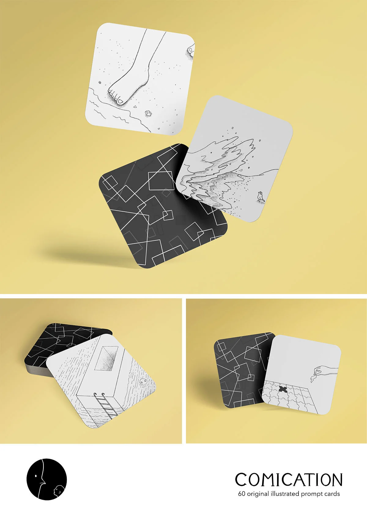 Comication is a collaborative drawing method designed to utilize traditional comics formats to initiate associative thinking and visual communication. This 60-card set of illustrated prompt cards combines game dynamics with team-based drawing to stimulate imagination and enhance creativity.